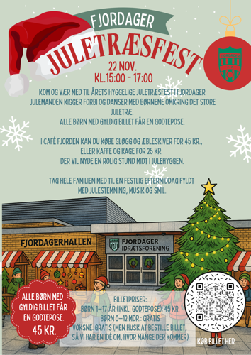 Juletræsfest 2025Lørdag den 22. november kl. 15.00–17.00Foran Fjordagerhallen